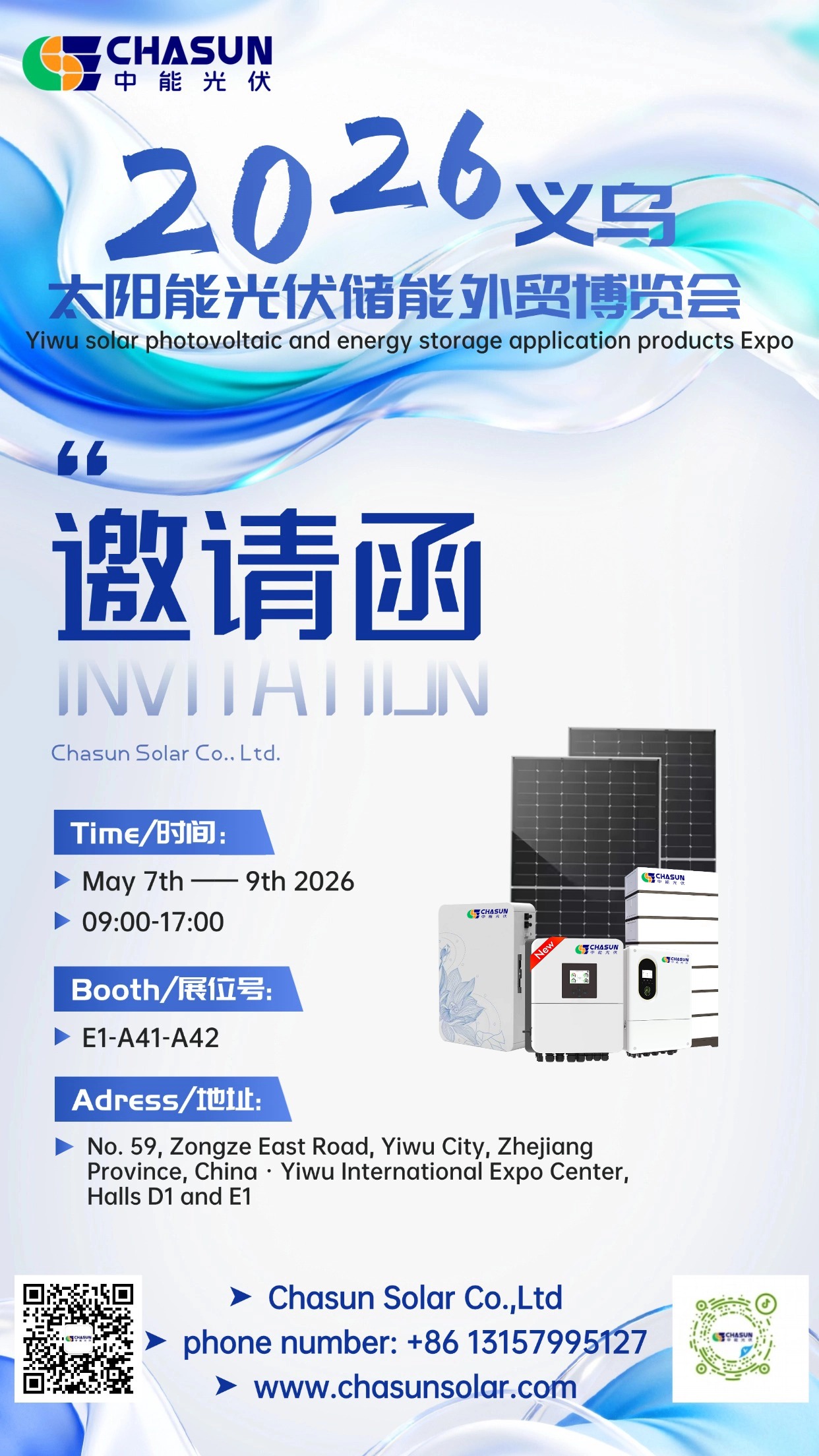 义乌太阳能+储能展览会是蔡森太阳能与全球客户深度交流的重要平台。我们诚挚邀请您莅临E1-A41-A42展位,了解我们的最新产品、分享技术成果并探讨合作模式。无论您是经销商、EPC总承包商还是项目开发商,如果您正在寻找高品质的太阳能+储能产品,蔡森太阳能都是您值得信赖的合作伙伴。