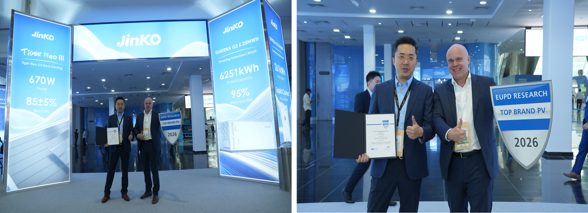 At the 2026 World Future Energy Summit (WFES) in Abu Dhabi, UAE, Jinko Solar achieved a remarkable double recognition on the global stage. The company was awarded the prestigious “Regional Solar Supplier of the Year” by the Middle East Solar Industry Association (MESIA) and certified as a “Top PV Brand for Middle East and North Africa” by the authoritative EUPD Research.