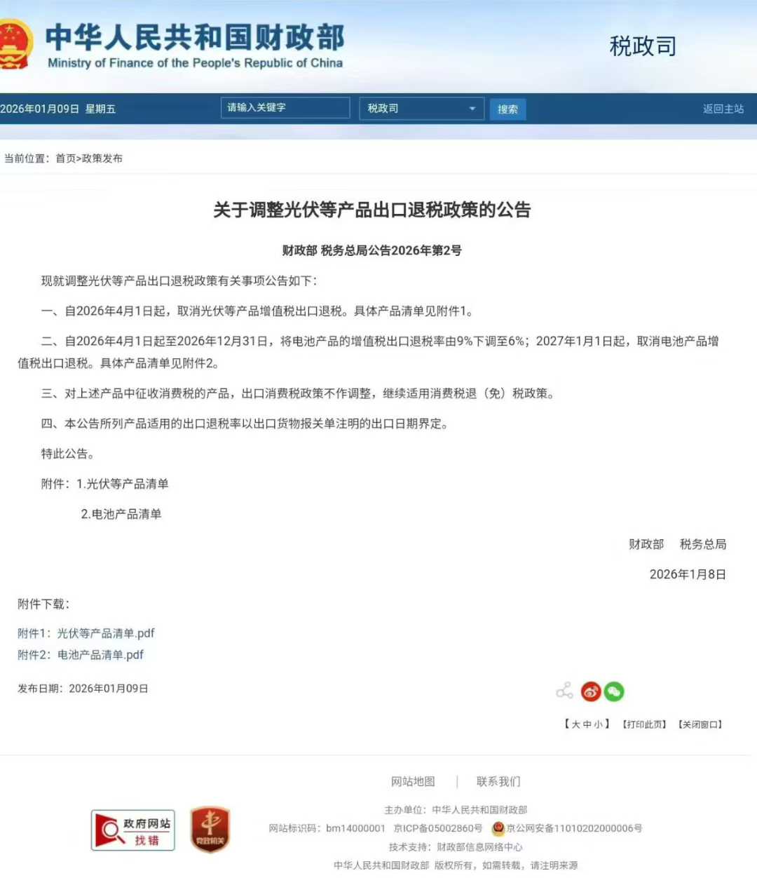 The Ministry of Finance of China has announced that the Value-Added Tax (VAT) Export Rebate for solar products will be completely canceled, effective April 1, 2026.