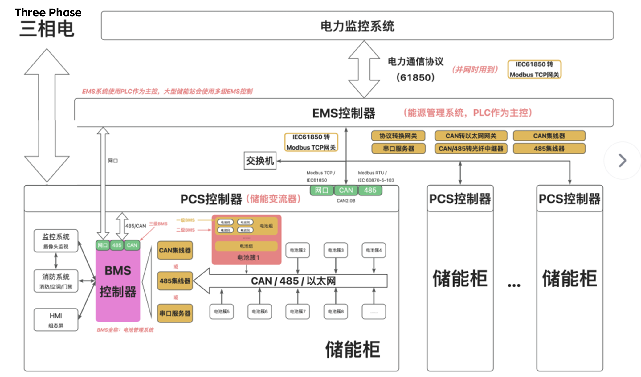 The PCS is the critical bi-directional converter. Unlike a solar inverter that only converts DC to AC, the PCS works both ways: converting AC power from the grid to DC for charging the batteries, and converting stored DC power from the batteries back to AC for discharge. It’s the essential gateway between the batteries and the power grid.